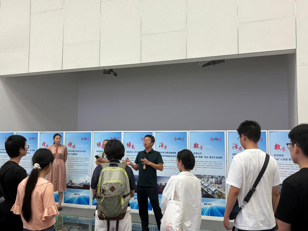 全体师生在讲解员带领下,通过观看视频短片、聆听沙盘、展板及模型讲解,详细了解了其发展脉络、“一带一轴两环一心”的总体规划格局、各功能区的分布定位和当前建设情况。北京城市副中心作为疏解非首都功能的战略支点、京津冀协同发展的动力引擎,正以“国际一流的和谐宜居之都示范区”等为目标,在新型城镇化、绿色生态与智慧城市融合等方面探索实践,展现出巨大的发展潜力,是中国式现代化进程中的城市发展样板。师生们对这座“未来之城”充满了向往。