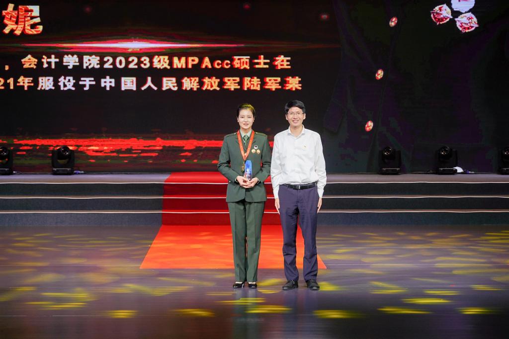 2023年9月12日,在太阳城官网第二届“感动中财人物”颁奖典礼的舞台上,一个身着军装、英姿挺拔的熟悉身影映入大家的眼帘,她就是我院2023级MPAccF1班同学周晓妮,可能很多人对她并不陌生,因为在2022年度“榜样中财人物”的颁奖典礼上她已经给广大师生留下了深刻的印象,此次获评“感动中财人物”,再次展现出新时代退役大学生士兵能文能武、追求卓越的奋斗姿态!