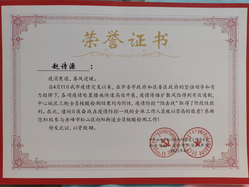 赵诗源同学参加家乡社区疫情防控志愿服务荣誉证书