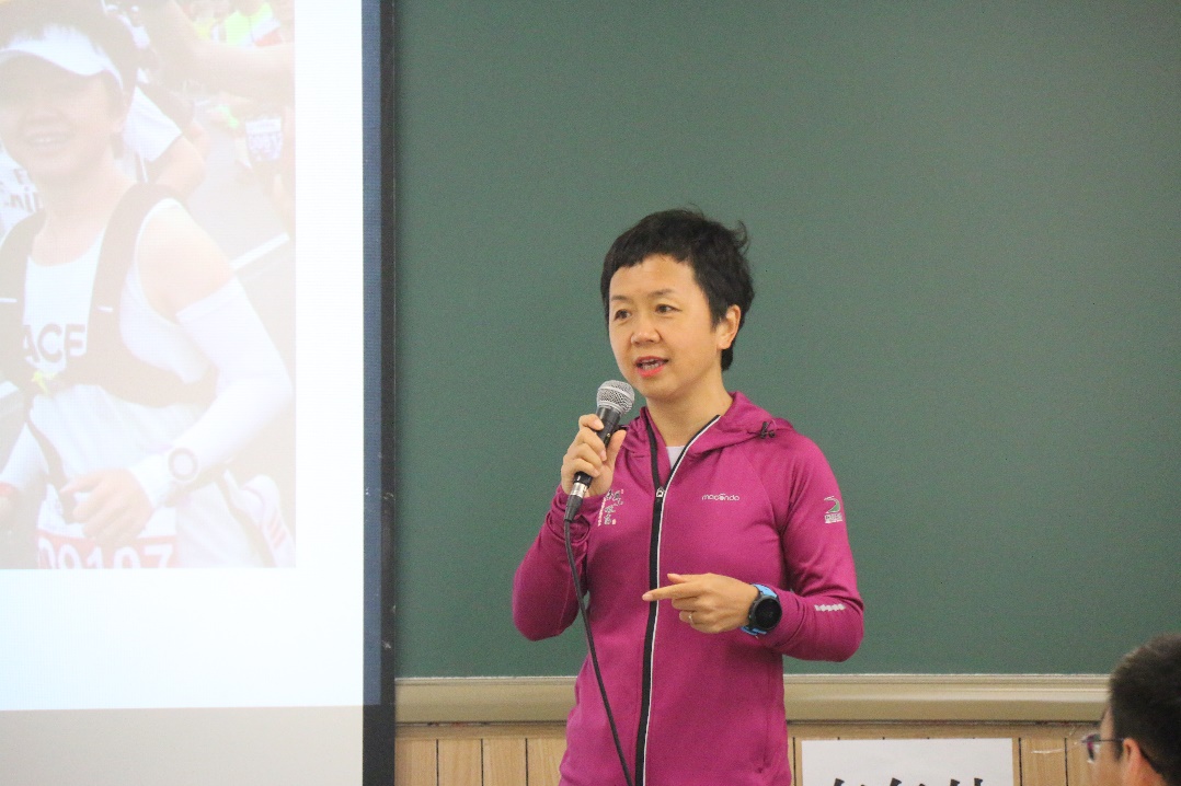 在讲座环节,石春健老师详细讲述了“无伤跑步技术”、“大众健康跑和减脂跑”的理论和技术要领,帮助师生尽快入门。一番讲解后,她现场示范、并指导师生进行动作体会训练。