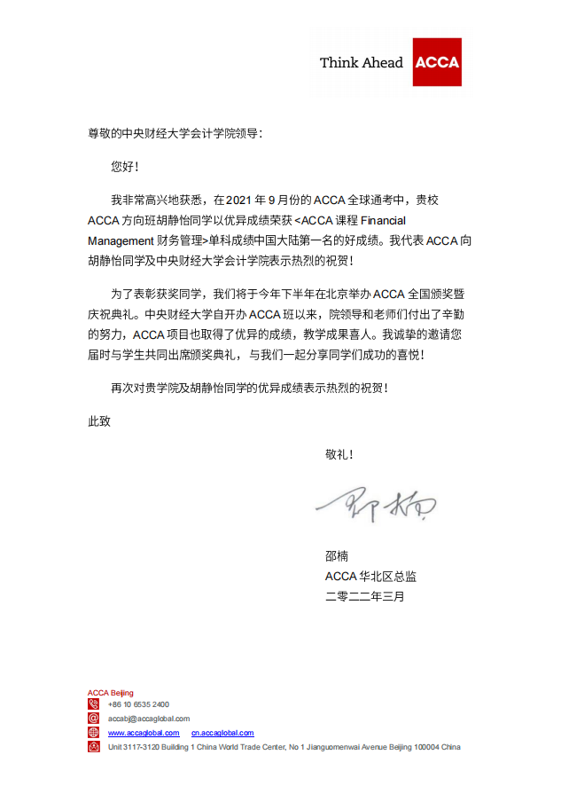 在2021年9月份举办的ACCA全球统一考试中,我院2018级本科生胡静怡同学荣获<ACCA课程Financial Management财务管理>单科成绩中国大陆第一名的好成绩。