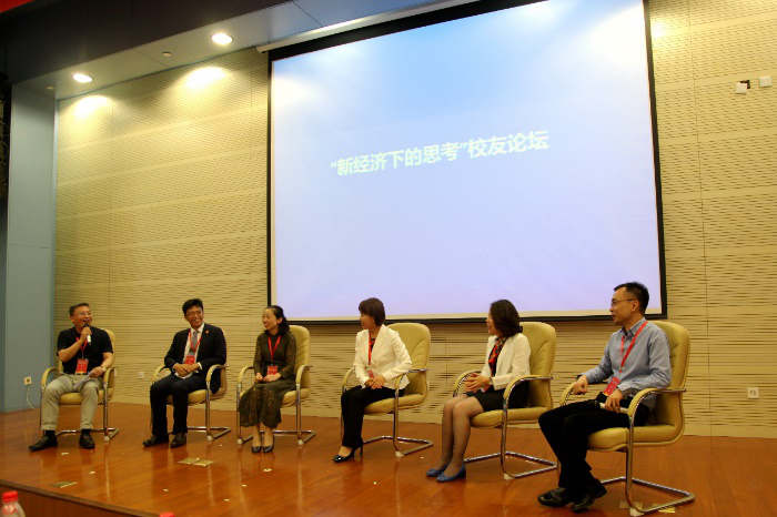 圆桌论坛环节,华辉家族行政总监白东华、仁歌股份副总经理石庆军、维东资本总经理张洪、安永合伙人李红军以及银信科技财务总监袁皓等五位校友进行圆桌论坛,各抒己见,针对各自领域对新经济下企业的发展面临的问题和构想进行详细阐述和讨论。