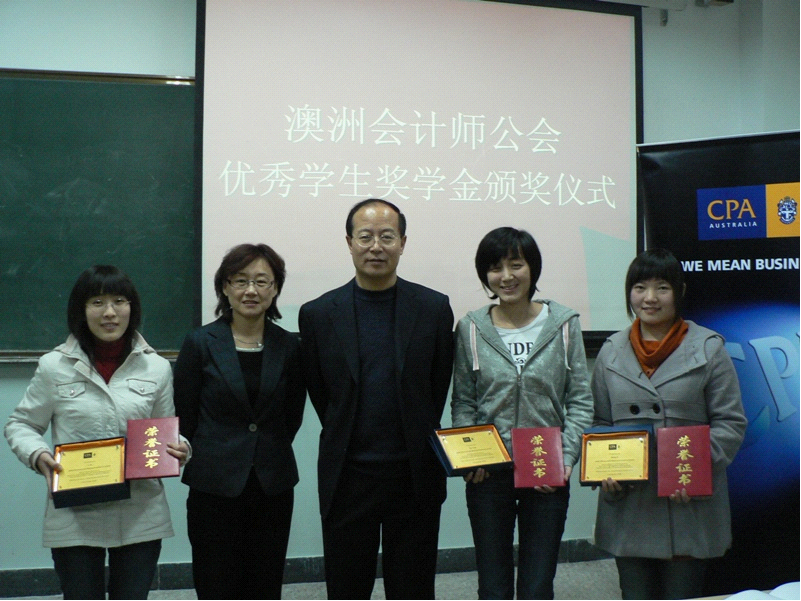 最后,孟焰院长、谷晓坤女士为获奖学生颁奖。三名获奖同学为:05级会计1班姚远、05级会计2班王益、06级财务管理班李亚。