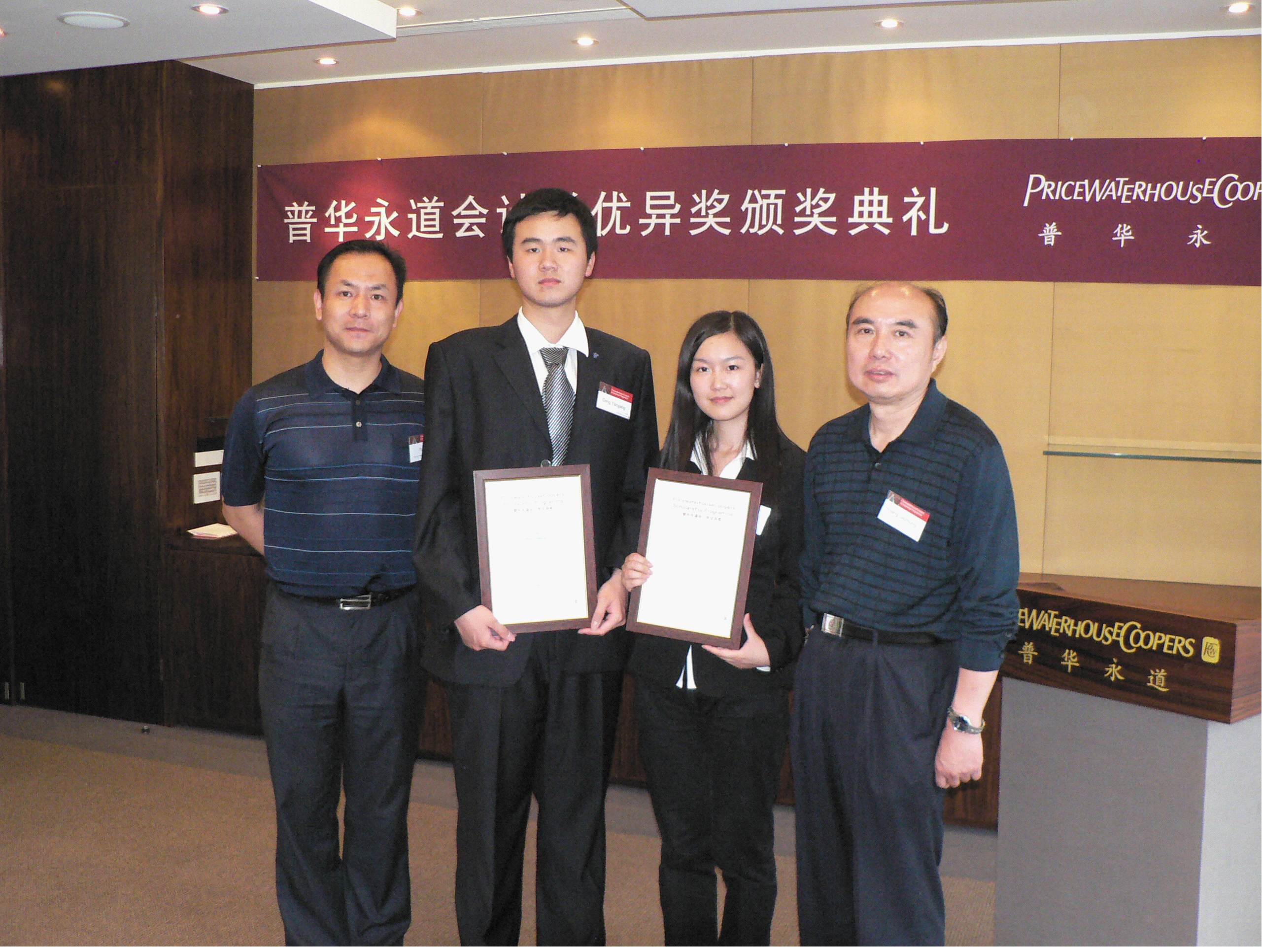 6月6日, “普华永道会计学优异奖”北京地区颁奖典礼在财富中心普华永道北京总部隆重举行。我院06注会班邓尧刚、06会计1班黄灏同学凭借过硬的综合素质获此殊荣。除获得奖学金外,两名同学还将获得普华永道事务所实习的机会。
