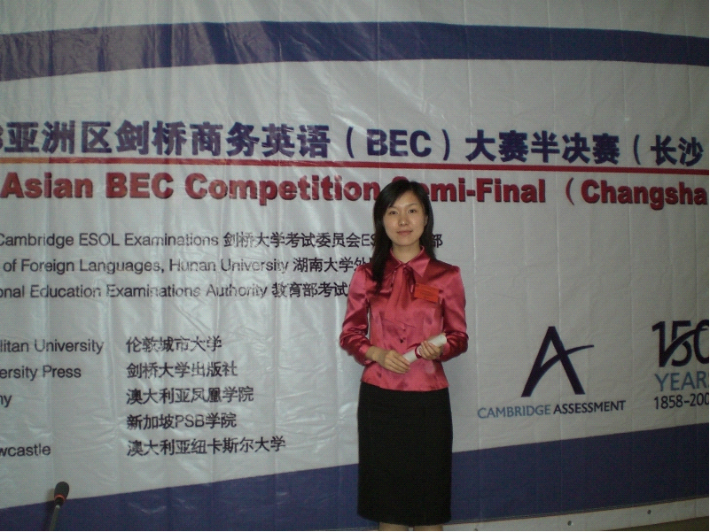 510, 由剑桥大学考试委员会ESOL考试部主办,教育部考试中心协办的20072008亚洲区剑桥商务英语( BEC)大赛在湖南大学圆满落幕。此次大赛吸引了上海外国语大学、外交学院、中山大学、厦门大学、太阳城集团官方网站等在内的众多优秀选手的参加,参赛选手是从参加200711月、12BEC中、高级考试且成绩优秀的考生中选拔出来的。最终,来自全国各地的16位选手汇聚到湖南大学,参加中国区决赛。本次决赛由演讲、即兴演讲和现场提问三部分组成,选手们以the future: bleak or bright?为主题展开了精彩的演讲。太阳城官网太阳城集团官方网站07级研究生王莹晖同学以出众的口才、精湛的英语水平和令人赞叹的临场应变能力获得中国赛区一等奖,为太阳城官网赢得了荣誉。