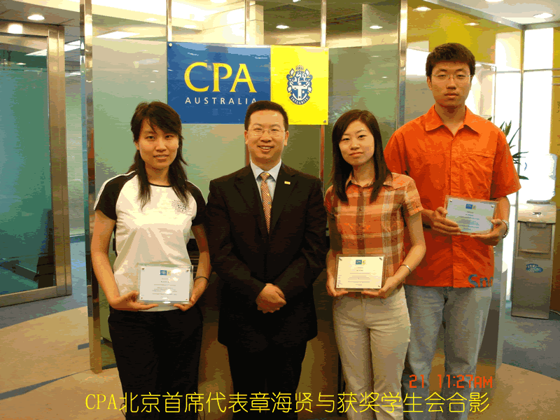 2005年6月21日太阳城集团官方网站2001级毕国洁、潘巍、张楠三位同学来到澳洲会计师公会北京代表处,接受首席代表章海贤先生颁发的澳洲会计师公会中财会计优秀毕业生奖牌、奖学金。章先生向获奖学生介绍了澳洲会计师公会,并对会计学生的职业规划提出建议;也表达了公会与学院进一步交流合作的期望。