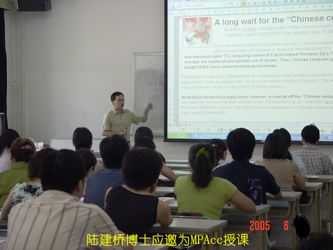 6月18日,财政部会计司处长、国际会计准则委员会研究员陆建桥博士应邀为MPAcc学员作财务会计课程的讲座,题目为《企业合并的会计问题》。陆博士首先介绍了企业合并的界定、动因及法律形式,接着结合TCL合并案例重点阐述了企业合并的支付方法和基本会计处理方法,最后深入地分析了企业合并的会计问题,包括如何判断合并效用、如何确定合并成本等。陆博士理论功底深厚,实践经验丰富,对企业合并的会计问题分析透彻,此次讲座获得了学员的一致好评。