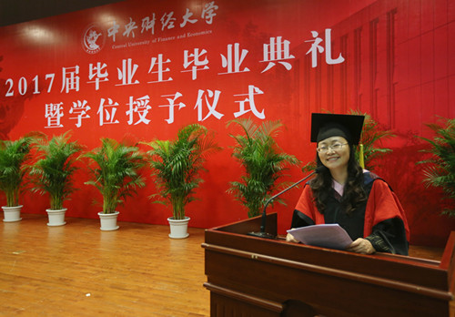 教师代表赵雪媛老师发言。同样作为一名中财校友,赵老师深情地追忆同学们带不走的校园和教室,也为同学们能带走的回忆与美好的情谊而欣慰。作为一名师长,赵老师将自己的人生体悟分享给毕业生,希望同学们保持学习成长的能力和动力,紧跟时代的步伐;保持人生的自信心,从挫折中获得历练;面对选择时明确不同选择的优先顺序,投资未来,回归生活。最后,赵老师祝全体毕业生鹏程万里,也希望同学们常报平安常回家看看。赵老师真情朴实的话语表达了对莘莘学子的关切之情,博得全场师生的阵阵掌声。