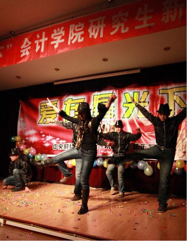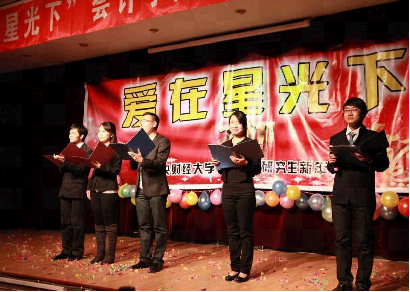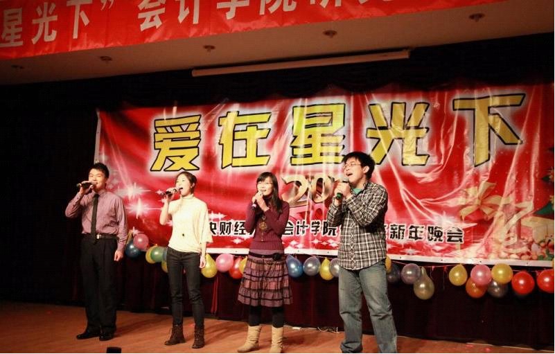 鹤发银丝映日月,丹心热血沃新花。诗朗诵《感恩老师》深情讲述了老师的对学生的关怀和不辞辛劳的工作,并表达了对老师的崇敬、感谢,和对即将离任的辅导员真挚的祝福。2010级普硕班辅导员郄尔平老师和MPACC班辅导员刘阳老师均上台与同学们合唱,带动了晚会的活跃气氛。
