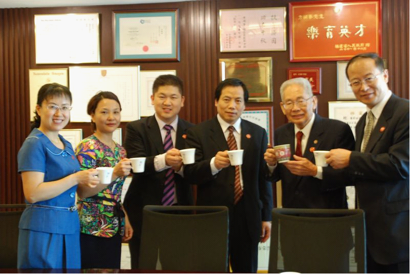 (左一孟雪副书记、左二梁海虎执行秘书、左三陈明副校长、左四马时亨教授、右五柯清辉副主席兼行政总裁、右四孟焰院长、右三安秀梅秘书长、右二方少龙校外导师、右一袁淳副院长)
