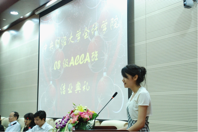 ACCA项目班专业课任课教师代表武弈老师随后发表讲话。武老师回忆了两年来与同学们共同度过的美好而难忘的学习时光,并代表08级ACCA项目班全体任课教师表达了对同学们的不舍之情。同时,武老师提出了对同学们希望和祝愿,武老师希望08级全体同学在海外求学的过程中磨练坚强的毅力,勇敢地面对困难和挑战,愉快的学习,健康的成长。