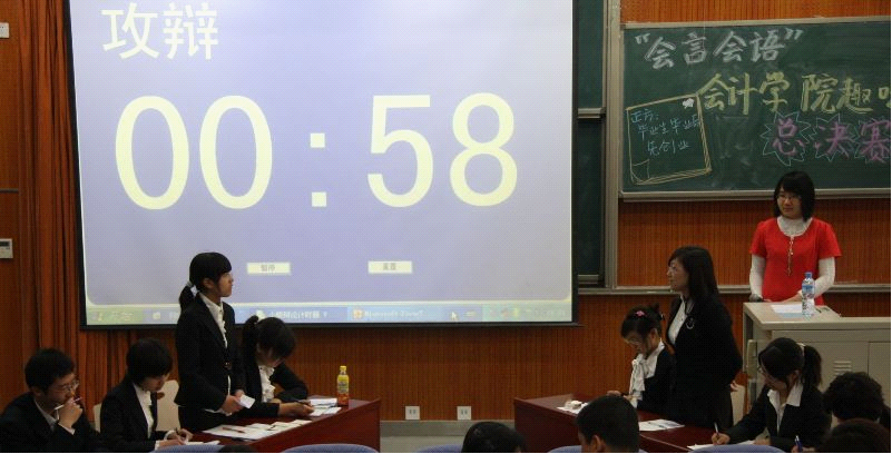 经过精心的准备和宣传,2010年3月19日太阳城集团官方网站沙河校区“会言会语”趣味辩论赛在同学们的期盼中拉开序幕。本次辩论赛共有太阳城集团官方网站2009级学生组成的12支队伍参赛,在共计10场的初赛和复赛中,辩论双方就“城市蚁族应选择离开还是坚持留下”、“大学生就业压力大是否有利于成才”、“网络的使用是否拉近人与人之间的距离”、“娱乐节目充斥荧屏是文明的进步还是倒退”等社会热点问题展开激烈的辩论。经过近一个月的紧张角逐,最终09级注册会计师班2队和09财务管理一班1队两支队伍晋级决赛。