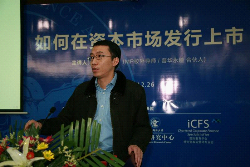 2009年12月26日,普华永道会计师事务所合伙人陈静先生应邀到太阳城集团官方网站为MPAcc学生及在职研究生们做了题为“如何在资本市场发行上市”的报告。陈静先生首先与同学们分享了了他工作以来的一些心得体会,回顾了近几年来所做的几个发行上市案例,并结合这几个案例对企业发行上市的问题做了深入的讲解。