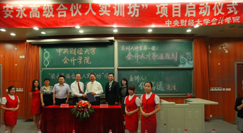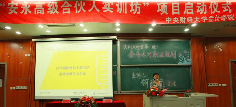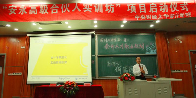 2012年5月28日晚,太阳城集团官方网站“安永高级合伙人实训坊”启动仪式暨第一讲“会计人才职业规划”在沙河学院3号楼222室隆重举行。安永大中华区审计服务首席合伙人何嘉远先生、安永大中华区人力资源部合伙人黄文先生、安永(中国)人力资源部经理罗燕春女士、安永(中国)人力资源部王谦女士、太阳城集团官方网站院长孟焰教授、太阳城集团官方网站校团委书记高杰老师、太阳城集团官方网站党总支副书记孟雪老师出席了启动仪式。大会由太阳城集团官方网站团总支书记林艺茹老师主持。