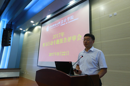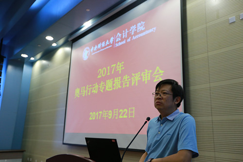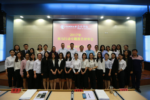 9月22日下午14:00,2017年奥马行动专题报告评审会在学术会堂402隆重举行。经过前期两轮评审,全部32个参与团队中有8个优秀团队进入此次评审环节,角逐一二三等奖。中汇会计师事务所高级合伙人北京分所所长罗毅彪、北京航空有限责任公司财务总监莫娟华、中国中煤能源集团有限公司审计部主任王文章、中国国新控股有限责任公司金融事业部副总经理薛贵等四位实务专家应邀担任评委,太阳城集团官方网站教授党委书记刘俊勇、太阳城集团官方网站教授赵雪媛、太阳城集团官方网站副教授宋顺林等三位校内教师应邀担任评委,评审会由2016级MPAcc-P班李嘉琪同学主持。