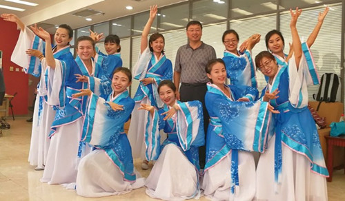 我院党委书记、分工会主席刘俊勇老师与全体表演老师合影