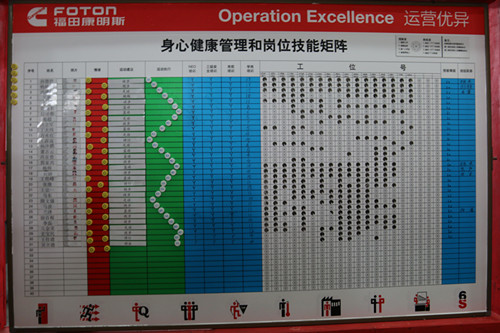 在负责人全程的引导和介绍中,同学们对整个工厂的运作有了较为全面的了解。其中有几处特别引起了大家的注意:车间内设置了员工身心健康管理和岗位技能矩阵图,并用有趣的图标进行展示,可见康明斯十分重视员工的工作状态;车间内共有12处“职工小家”,各个生产班组用废料和自己DIY的作品装饰这个休息空间,让工厂看起来更有家的感觉。