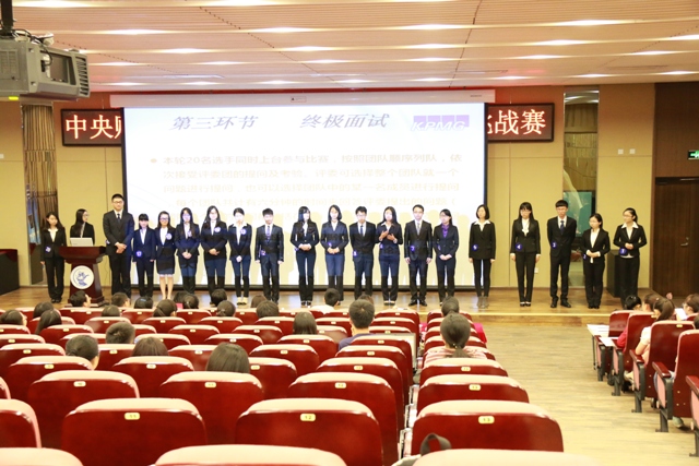 首先进行的是第一项,团队展示。本环节每个团队有两分钟的自我展示时间,团队可自定主题与形式,体现出本团队的成员特色、竞争优势及综合能力。五支队伍你方唱罢我登场,各显神通,展现出了中财学子多才多艺的一面。在才艺展示中,有动听的自编歌曲演唱,有优美蹁跹的舞蹈表演,有幽默活泼的小品,各组的表演形式不尽相同,但都同样的精彩纷呈,赢得了现场的阵阵掌声。