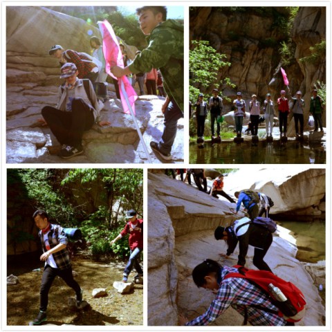 早晨9点,参训人员到达延庆水泉沟。经过充分的热身活动后,教练对60名学员进行了随机分组,组成粉红色的回忆、大洼求生、星星之火、六芒星、绿箭侠和巡山队六支队伍。各支队伍确定了自己的队名、队长、队歌并做团队展示。