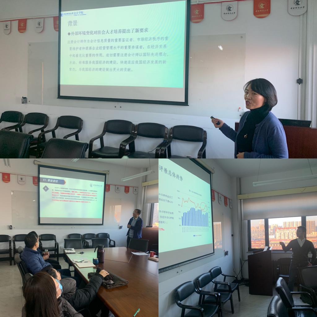 教学发展与评估中心王百强和审计系主任王淑芳分别对“大数据+会计实验班培养方案设计思路”和“大数据+注会实验班培养方案设计思路”进行了介绍,从实验班设置背景、培养目标、方案可行性、可操作性、前期筹备、课程论证等多个方面介绍目前这两个培养方案的设计情况。