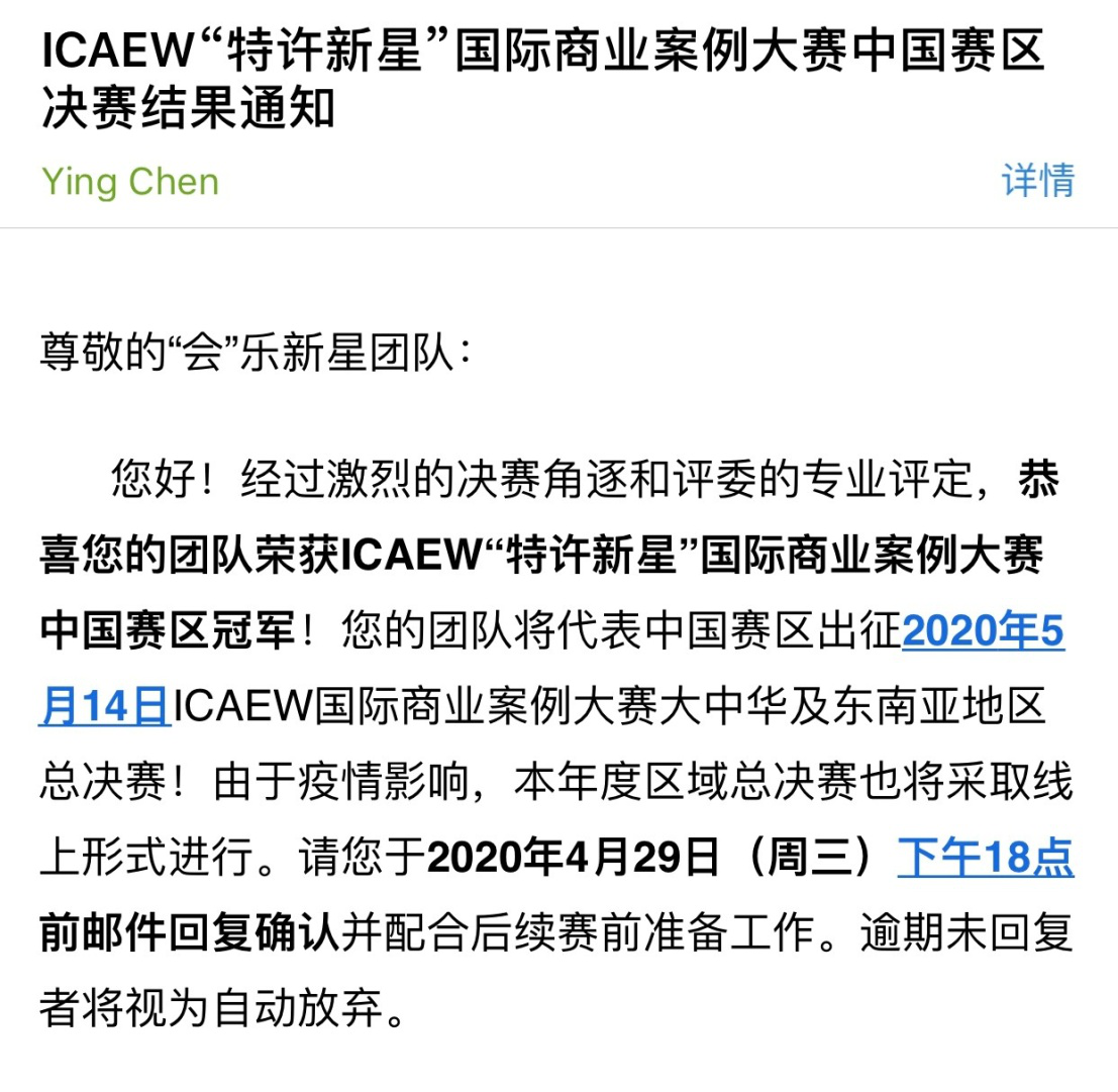 2020 ICAEW“特许新星”国际商业案例大赛中国赛区决赛于4月8日至4月22日成功举办。在激烈的决赛比拼中,由我院2017级本科生姜宜辰、李慧婷、解怀灵、祖萍、饶云、陈乐恬等六名同学组成的“会乐新星”队,获得中国赛区决赛冠军。