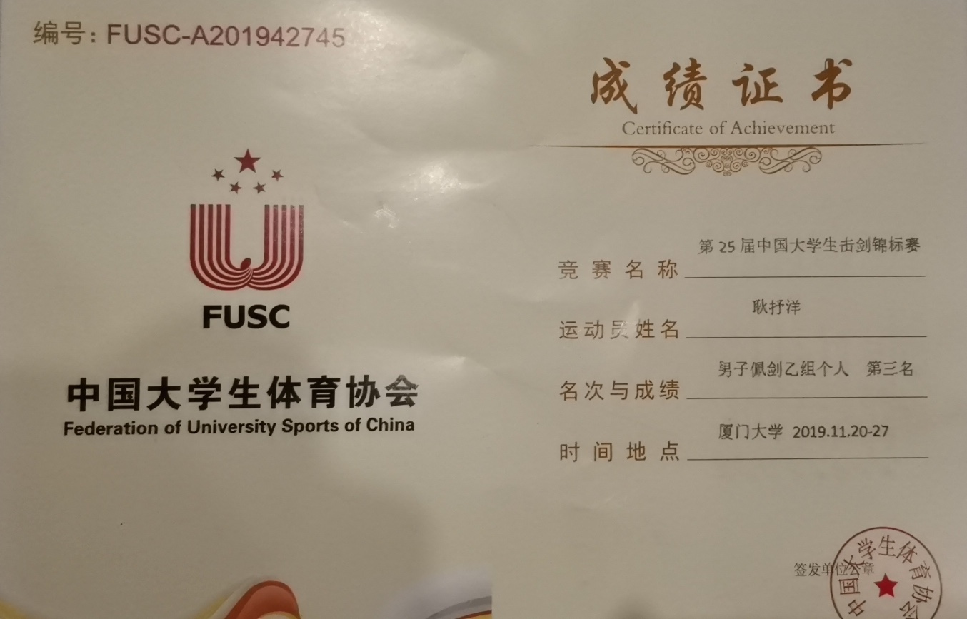 在刚刚结束的第25届中国大学生击剑锦标赛中,太阳城官网太阳城集团官方网站2019级本科生耿抒洋凭借出色的发挥,荣获男子佩剑乙组个人第三名。