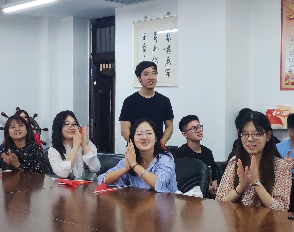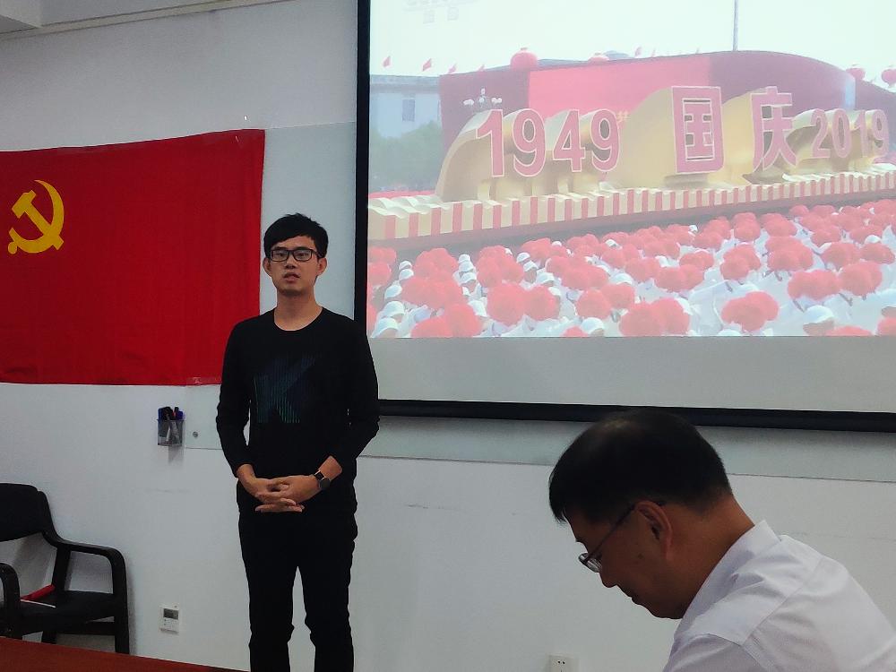 程卓同志发言,一起观看阅兵式的三个小时,见证了这个辉煌的时代,为祖国今日的繁荣富强感到由衷的骄傲,也深感中财会院青年热忱真挚的爱国之情。天戴其苍,地履其黄,纵有千古,横有八荒。前途似海,来日方长。作为当代中国青年,作为一名中共党员,我们定当不忘初心、牢记使命,为国之繁荣贡献自己的力量;我们必将坚定信念,负重前行,为祖国创造更美好的明天。