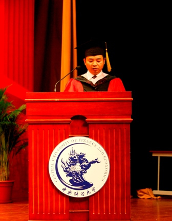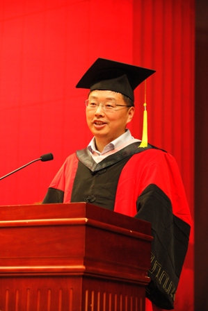 袁淳院长代表学院向全体毕业生致辞。袁院长向2016届全体毕业生圆满完成学业表示热烈的祝贺,和毕业生一起分享了对离别、对母校和对身份转变的思考,并给予了爱学习、有爱心、享受生活的深情寄语。袁院长深切希望每一位毕业生走入社会后用良好的学习能力和思考能力求解社会中的难题;用爱和温暖对抗和化解社会的变数与残酷,用正直、诚信、良知和担当打动人心;用心去感受生命的点点滴滴,不忘与心灵对话。最后,袁院长祝福同学们走出中财校园后有更广阔的世界和更精彩的未来,无论走的多远,都记住这片绿草地上的龙马担乾坤,前程似锦,心想事成。