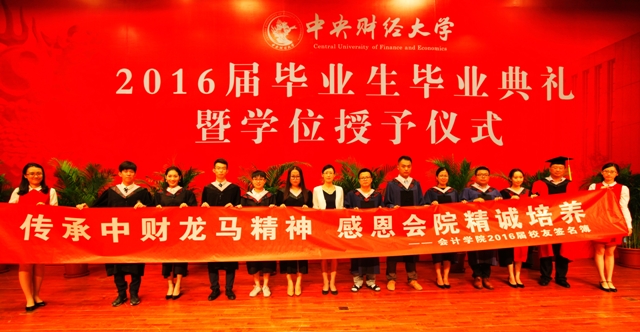2016届毕业生代表,来自2013级会计博士班的安吉娃、2014级MPAcc-F班的冯雨筱、2014级MPAcc-P班的李爱静以及2012级财务管理班的李昕代表全体太阳城集团官方网站毕业生上台发表毕业感言。他们以真挚的情感回忆了大学生活的点点滴滴,以真情的话语道出了对师长和亲朋的感激与留恋,以昂扬的斗志表达了用实际行动做好中财会院人,共同创造中财会院美好明天的决心。