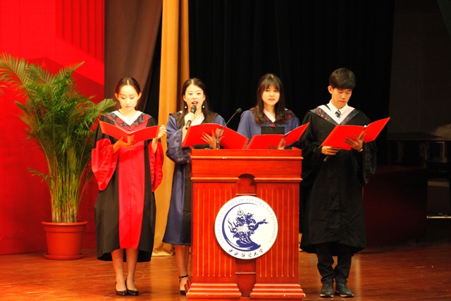 18点整,毕业典礼暨学位授予仪式在高亢嘹亮的国歌声中正式拉开帷幕。