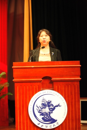 教师代表林秀香老师发言。作为一名师长和母亲,林老师劝诫同学们要孝敬父母,记住长辈的教导,挂满阳光灿烂的微笑,并从中华传统文化中汲取能量。作为一名中财学子,林老师期盼同学们记住母校,以母校为傲。同时,林老师也希冀同学们勇敢前行,学会赞美自己,用心做事,快乐生活。林老师真情朴实的话语表达了对莘莘学子的关切之情,博得全场师生的阵阵掌声。
