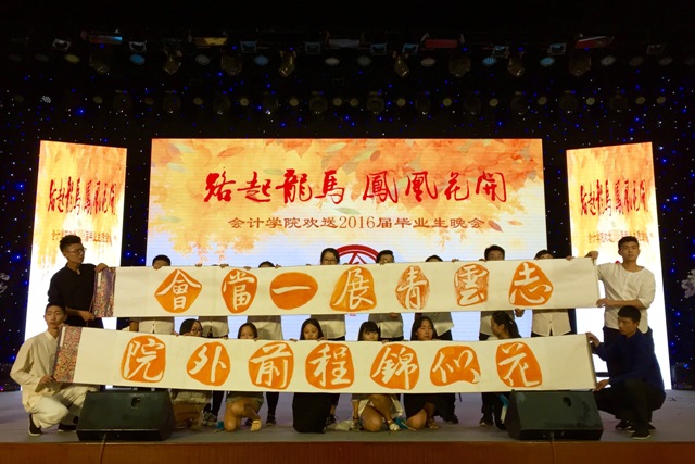 由2014级MPAcc & Maud F班的姑娘们带来的舞蹈《NoNoNo》用热辣的舞姿、优美的体型展现了他们的风采;2012级注会班的短剧《我们毕业了》用幽默风趣的相声、热烈激情的模特表演和独创的说唱展现了班级风采,表现出中财学子的青春活力,现场气氛十分热烈;由张玥、聂康、金家璐、毛嘉淳带来歌曲《再回首》,一句“平平淡淡才是真”道出毕业生的生活沉淀与成长;2014级MPACC-P班同学们带来的《we are 伐木累-我为舞狂》都用他们自己的方式表达了对会院的不舍,对母校的不舍;临别在即,沙河校区会院艺术团同学们也带来了精心准备的节目,2014级和2015级的学弟学妹们通过舞蹈、书法描绘了一幅画面感极强的《青花瓷》为毕业生学长学姐送别,“会当一展青云志,院外前程似锦花”,祝愿他们拥有美好的明天,锦绣的前程。