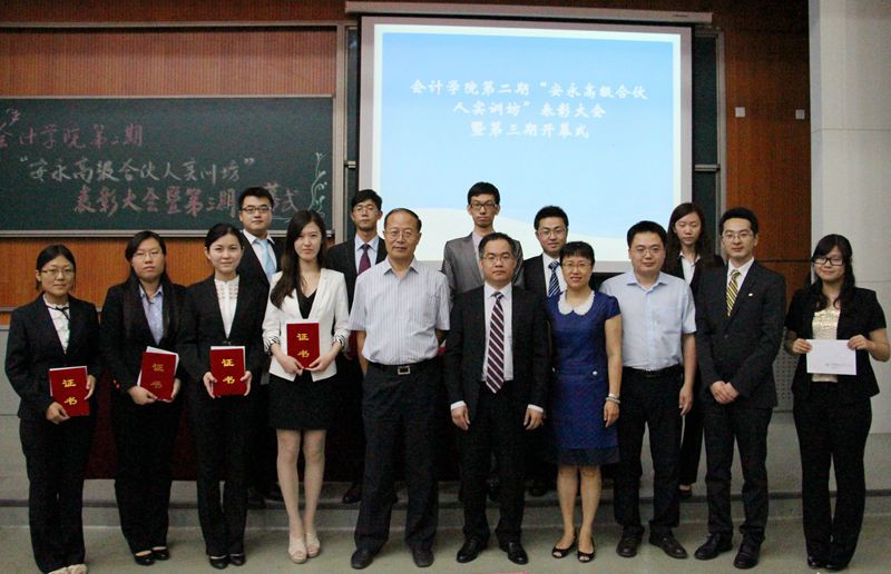 2014年6月20日晚,在沙河校区学院4号楼107教室,太阳城集团官方网站举办了第二期“安永高级合伙人实训坊”表彰大会暨第三期开幕式。安永会计师事务所大中华区金融服务合伙人许旭明先生,安永(中国)人力资源部刘奇先生,太阳城集团官方网站校团委书记高杰老师,太阳城集团官方网站院长孟焰老师、党总支副书记孟雪老师、学生工作办公室主任王伟老师、团总支书记林艺茹老师以及2013级辅导员汤玥老师出席了本次活动。