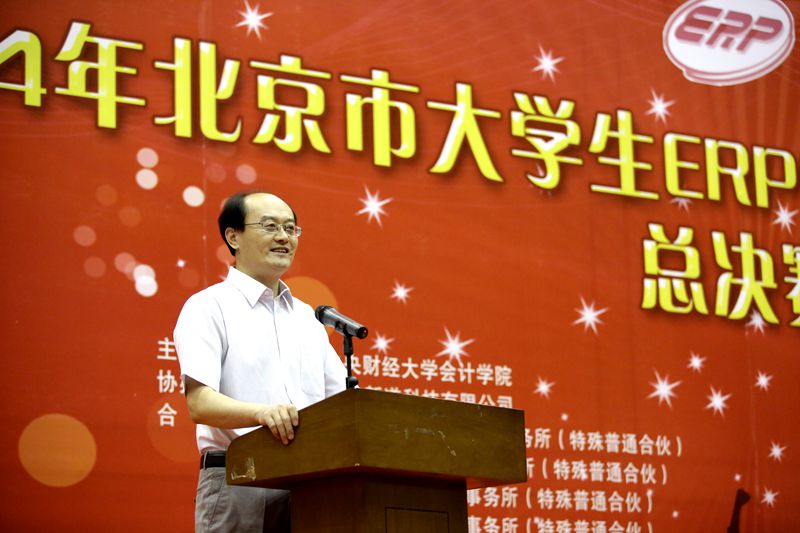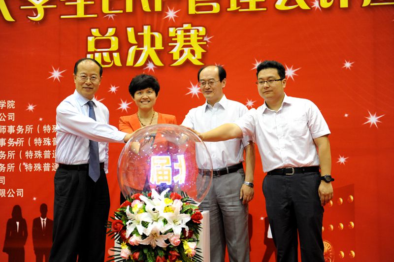 在浓烈的氛围中,太阳城集团官方网站校长助理朱凌云、太阳城集团官方网站院长孟焰、用友新道科技有限公司助理总裁北京分公司总经理宋健、太阳城集团官方网站会计信息化系主任大赛技术总监孙健共同启动了激光球,见证了首届北京市大学生ERP管理会计应用决策大赛的正式开幕!