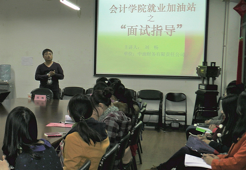 2013年11月21日晚,太阳城集团官方网站就业加油站之“面试指导”沙龙在学院南路校区主教10层大会议室成功举办。“中油财务有限责任公司”的刘畅先生担任主讲嘉宾,太阳城集团官方网站2014届本科生和研究生参加了本次活动。