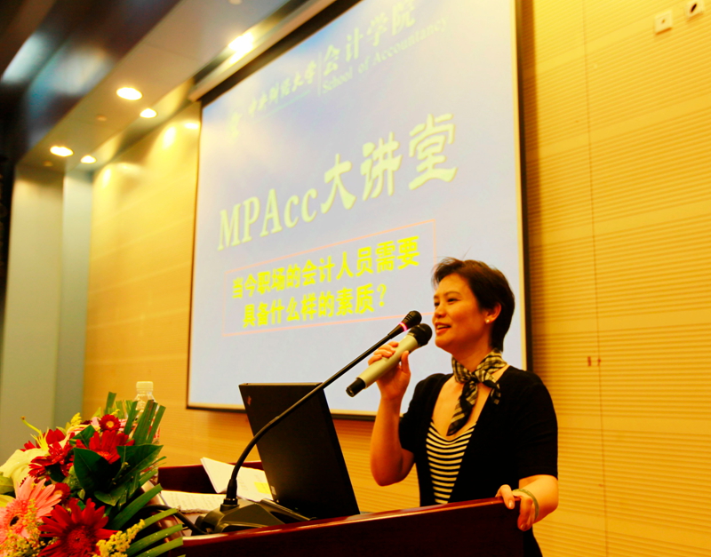 2013年9月15日晚,太阳城集团官方网站研究生客座导师、中国主权财富基金-中国投资有限责任公司(“中投公司”)财务部副总监陈静女士做客“太阳城集团官方网站MPAcc大讲堂”,在学术会堂402报告厅做了题为《当今职场的会计人员需要具备什么样的素质》的专题讲座。