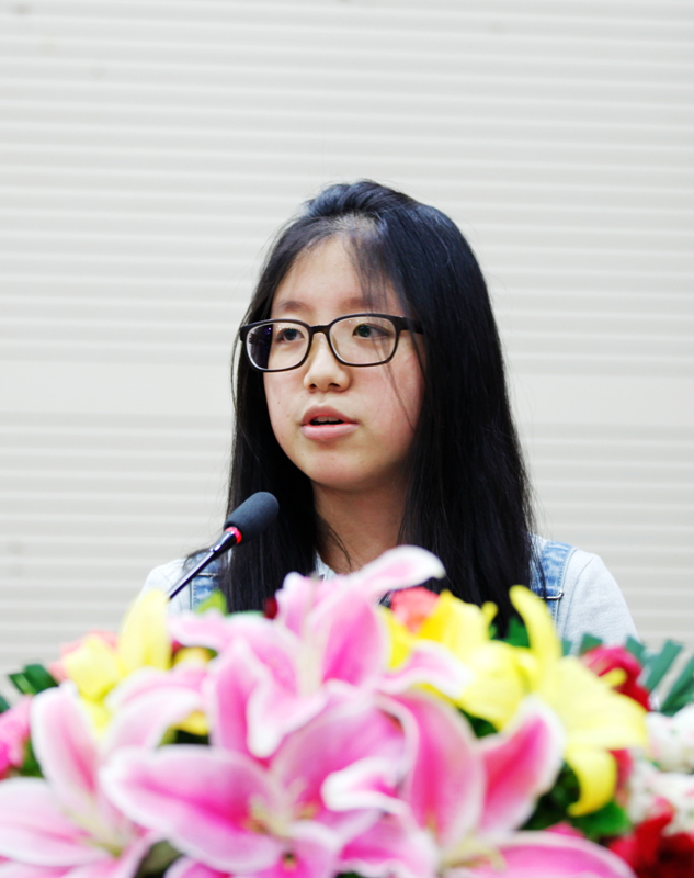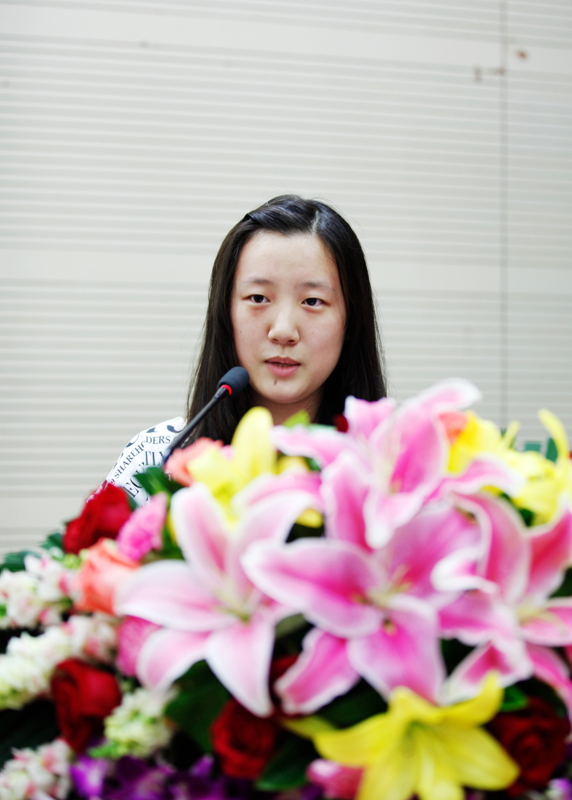 接着,2011级学生代表李婧同学首先代表毕业生用英语发言。李婧同学回顾了两年来与同学们一起汲取知识、共享友情、畅想明天、品味成长的美好时光。她代表毕业生表达了对母校的感激之情,绝不辜负母校的培养和期望。