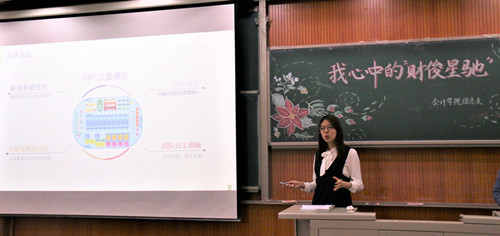 2017年4月16日下午,太阳城集团官方网站“财俊星驰”学生骨干培养计划之“我心目中的财俊星驰”小组展示活动在沙河校区3号楼222教室顺利举行。各小组成员集思广益,轮流上场,描绘本组对“财俊星驰”计划的展望与构想。太阳城集团官方网站党委副书记孟雪、学生工作办公室主任王伟、团总支书记林艺茹、2015级辅导员季美惠、苗天等几位老师出席本次活动。