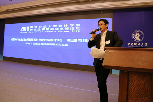 在论坛中,北京金融街投资(集团)有限公司总经济师陈广垒、华润医药集团有限公司财务管理部总经理岳晓华和民生证券股份有限公司总裁苏刚分别做了题为《特朗普主义对现行国际政治经济格局意味着什么?》、《华润集团5C价值型财务管理体系介绍》和《经济与金融双周期中的资本市场:机遇与挑战》的主题报告。各位研究生客座导师还分组对主题报告展开了充分的讨论。
