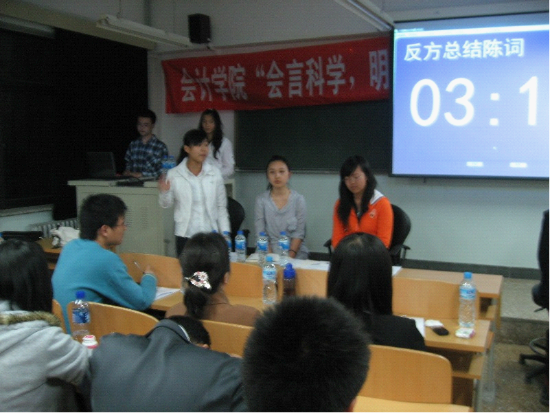 参赛的两支队伍是2007级注册会计师班和2007级会计一班。决赛的辩题是“经济发达地区还是经济欠发达地区更需要人才”。双方辩手们经过充分的准备,对辩题理解得相当充分。在注意语言的美感之外,也充分注意自身的形象风度,让观众大饱眼福和耳福。无论在立论还是自由辩论阶段都高潮迭起,十分精彩。在辩论场上也常常出现一些出人意料的观点,夸张的个性化语言,引经据典,珠玑妙语横飞,让观众深深地感到辩手的渊博与机智。