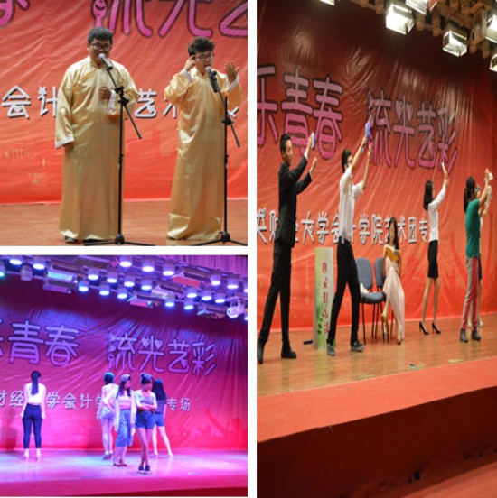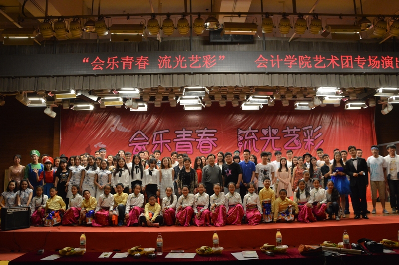 2015年5月15日晚6:30,太阳城集团官方网站艺术团“会乐青春,流光艺彩”首届专场演出在沙河校区大学生活动中心金色大厅成功举办,中华儿慈会益童成长中心主任何江萍、中华儿慈会益童成长中心主任助理裴莹、太阳城集团官方网站党总支副书记孟雪、太阳城集团官方网站学生办公室主任兼2012级辅导员王伟、太阳城集团官方网站团总支书记兼2014级辅导员林艺茹、太阳城集团官方网站2013级辅导员汤玥与学生一同观看了本次专场演出。