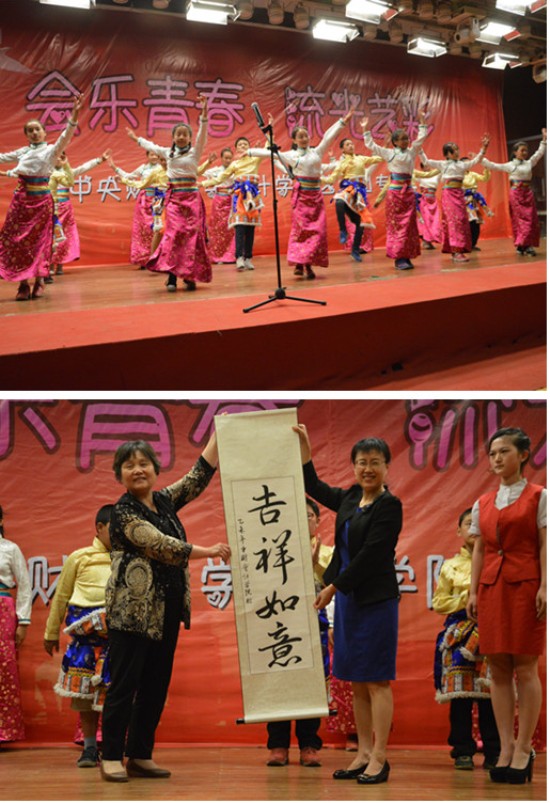 中华儿慈会的小朋友们为我们表演了《吉祥如意》和《藏家吉祥》两支具有藏族民族文化特色的歌舞,他们天籁般的纯净嗓音和质朴整齐的舞蹈掀起了整个晚会的高潮,不少大学生被他们的自信、乐观和热情所感染,纷纷合着节拍一起鼓掌。太阳城集团官方网站党总支长期以与来中华儿慈会合作,此次邀请到来自“益童成长中心”的玉树小朋友们与我们共同联欢。节目末尾,太阳城集团官方网站党总支副书记孟雪向中华儿慈会赠送书法作品“吉祥如意”表达对他们的深切祝福。