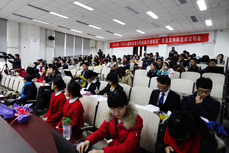 2012年12月1日,太阳城集团官方网站“ACCA国际化会计职业能力训练班”信息发布和选拔说明会在沙河校区主教学楼108教室顺利召开。本次活动邀请到了中国教育出版传媒股份有限公司财务部主任王剑辉先生作为嘉宾,太阳城集团官方网站院长孟焰教授、副院长袁淳教授、党总支副书记孟雪老师、ACCA教育中心主任武羿老师也参加了此次说明会。本次说明会由袁淳教授主持。
