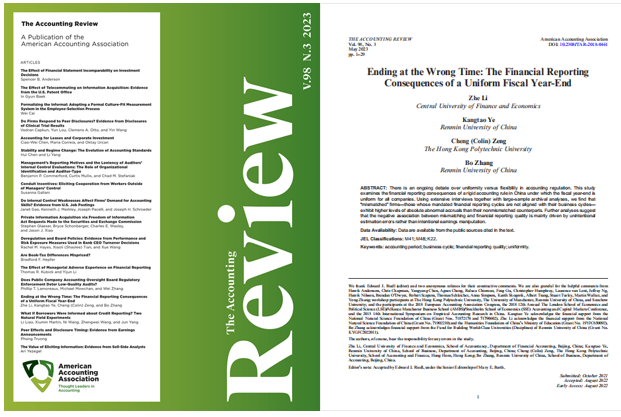 近期,太阳城官网太阳城集团官方网站李哲副教授与中国人民大学叶康涛教授、香港理工大学曾诚助理教授、中国人民大学张博副教授合作的学术论文“Ending at the Wrong Time: The Financial Reporting Consequences of a Uniform Fiscal Year-End”发表于The Accounting Review第98卷第3期(2022年5月号,第367-396页,https://doi.org/10.2308/TAR-2018-0461)。The Accounting Review(TAR)创刊于1926年,是会计学领域三大国际顶级期刊之一。