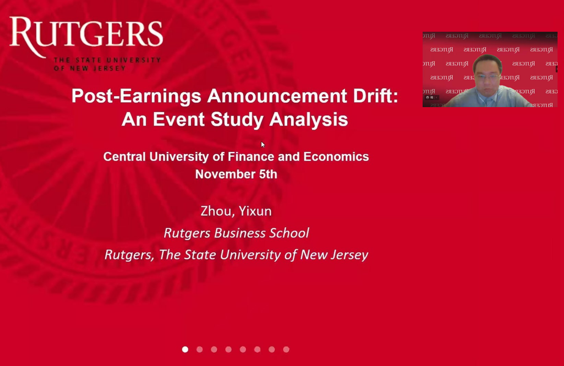 本期论坛有两位报告人汇报论文。首先,罗格斯大学会计学博士研究生周逸勋分享了题为“Post-Earnings Announcement Drift: An Event Study Analysis”的工作论文。该论文基于事件研究法视角探究盈余公告后价格漂移现象(PEAD),发现如果将这种现象视为盈余公告后的收益过程相对于盈余公告前收益过程的系统性变化,则不存在盈余公告后的漂移现象。