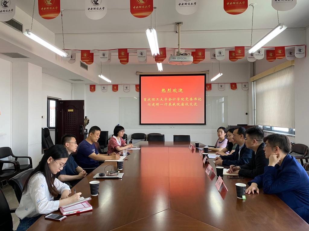 2021年5月25日上午,重庆理工大学太阳城集团官方网站阎建明书记一行来我院进行交流访问。太阳城集团官方网站院长吴溪、副院长王彦超、教学科研管理办公室主任赵莹接待了来访人员,双方进行了深入的沟通交流。