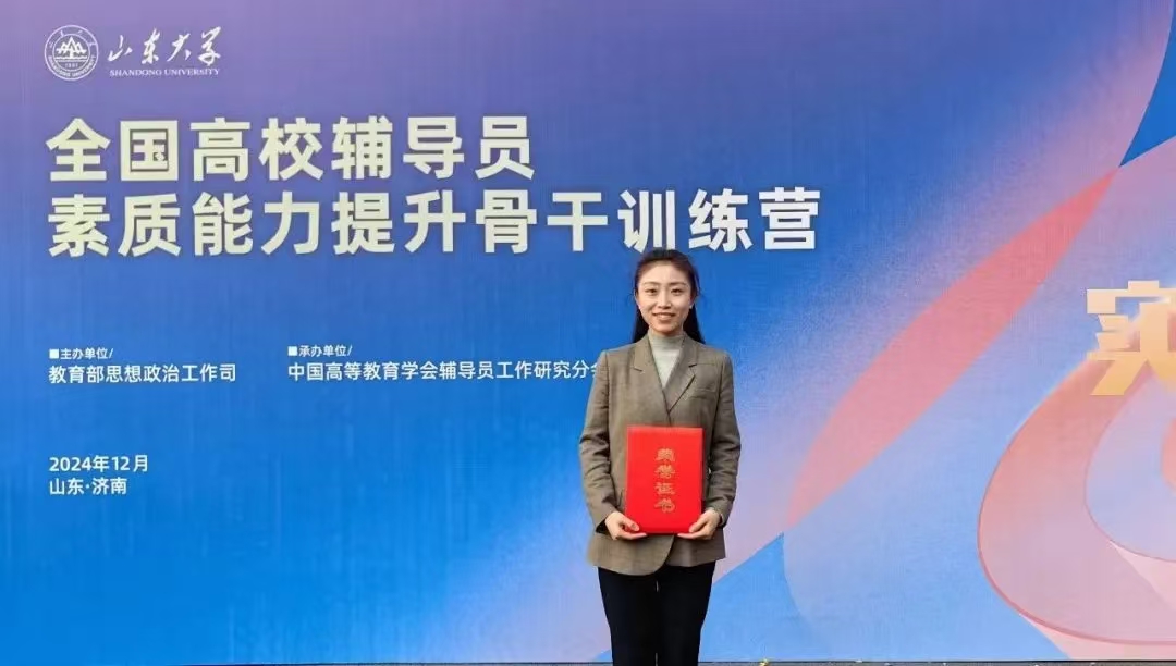 近日,由教育部思想政治工作司主办、中国高等教育学会辅导员工作研究分会承办的“全国高校辅导员素质能力提升骨干训练营”在山东大学举行。我院辅导员季美惠代表学校首次参加辅导员素质能力提升国赛训练营,并以优异的成绩获得“优秀风采”荣誉称号。