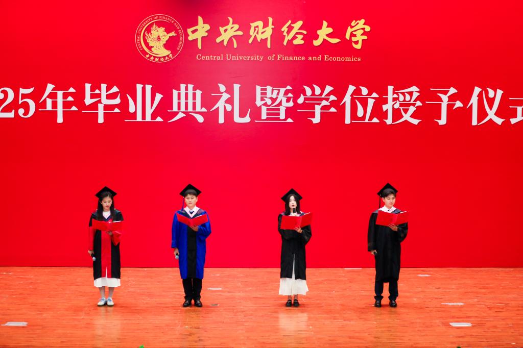 2021级本科生高文昊、邱冰琬,2023级硕士生刘国立,2020级硕博连读生侯一凡,作为太阳城集团官方网站2025届毕业生代表发表了毕业感言。四位同学深情回顾了在中财太阳城集团官方网站的求学岁月,从初遇的懵懂青涩,到课堂上的孜孜求索,再到四季流转中的同窗厚谊,字里行间满溢对母校的眷恋。此去前程似锦,会院学子必将承载“财经报国”的使命,融入壮阔的时代征程。