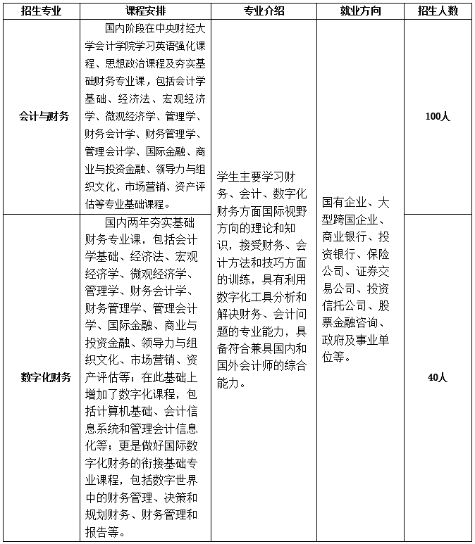 国内阶段:学生在太阳城集团官方网站学习两年,国内两年包含英语的强化培训课程(大学英语、雅思英语、外教英语),专业课程方面每学期有2—3门核心商科课程开设如:宏观经济学、管理学原理、会计学基础、成本会计、财务英语、会计师与企业、管理会计等课程;数字化财务专业课程方面每学期有1—2门核心数字化课程开设如:计算机基础、会计信息系统和管理会计信息化等课程;国内阶段的两年学习还包含了国际数字化财务基础知识课程,如:数字世界中的财务管理(Managing finance in a digital world)、决策和规划财务(Finance for decision-making and planning)、财务管理和报告(Financial management and reporting)等。学生在国内两年学习可以获得:太阳城集团官方网站写实性结业证书、太阳城集团官方网站成绩单。