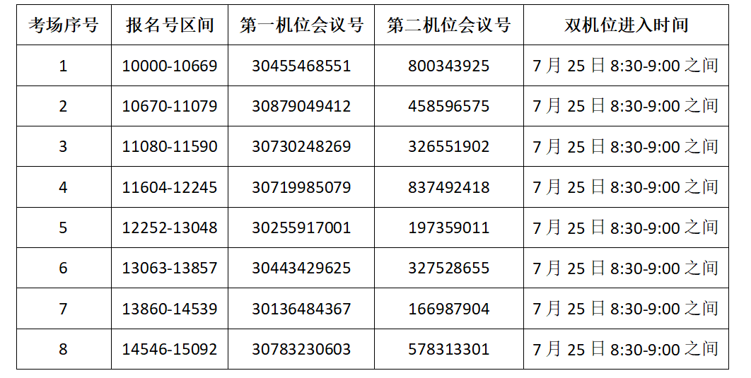 1.请各位同学按照下表要求分别通过第一机位(钉钉会议)和第二机位(腾讯会议)进入对应的会议室,进入后,所有考试结束后方可退出。